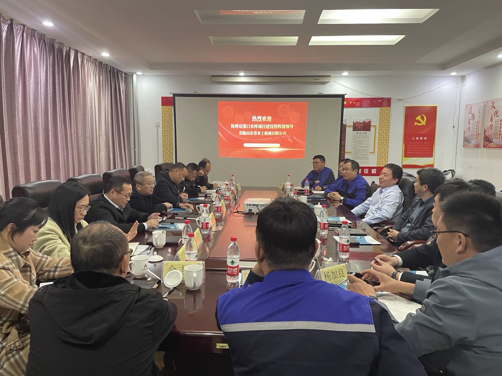11月13日-14日,杭州市临安区双溪口水库工程建设指挥部副总指挥、水利水电局党委副书记刘保法等一行莅临水工机械公司考察指导工作,山东水总党委副书记、董事、总经理靳文硕,党委委员、副总经理付海华,第六分公司、杭州鲁润公司等相关人员陪同考察。